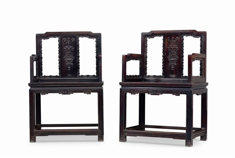 中国太师椅拍卖榜第3名 清乾隆 紫檀双蝠勾纹太师椅 (一对)