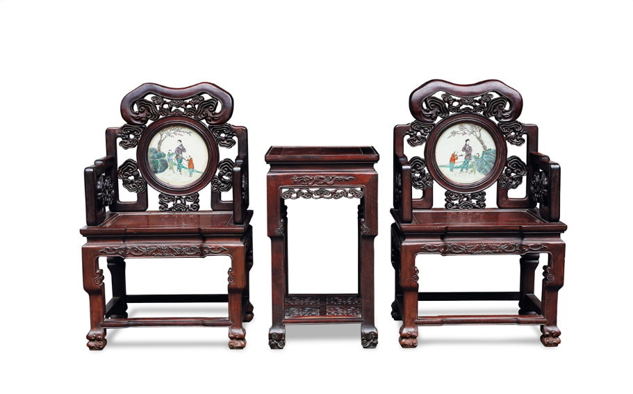 拍品为三件组合,为明清家具常见的形式。太师椅是最能体现清式家具的造型特点,它体态宽大,靠背与扶手常为三扇、五扇或者多扇的围屏。太师椅也是唯一用官职来命名的椅子,它最早见于宋代,最初形式类似于交椅。到清代,太师椅变成了一种扶手椅的专称,且在坐具中占据了主要地位。此对太师椅背板与扶手镂雕如意云头纹,搭脑形与主体纹饰相呼应,背板嵌粉彩教子图瓷版画,座面以整块红木落堂起鼓做。