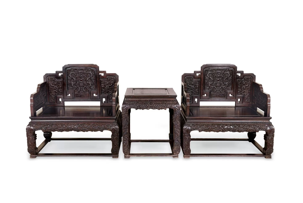 中国太师椅拍卖榜第28名 清中期 红木雕瑞兽太师椅 (三件)