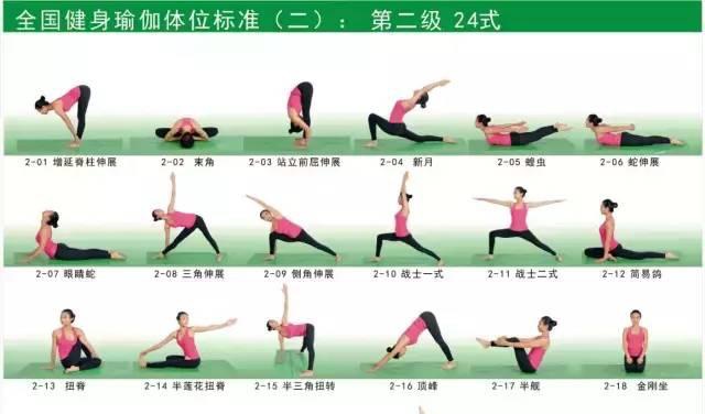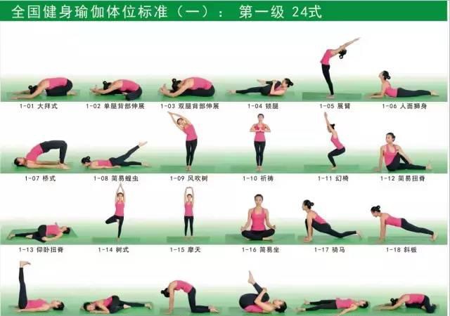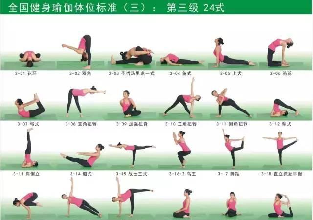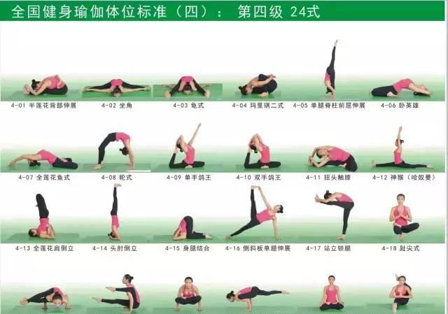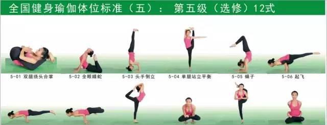 瑜伽的基本体位有108式,按体位的难易程度由低到高可划分一至五级,其中: