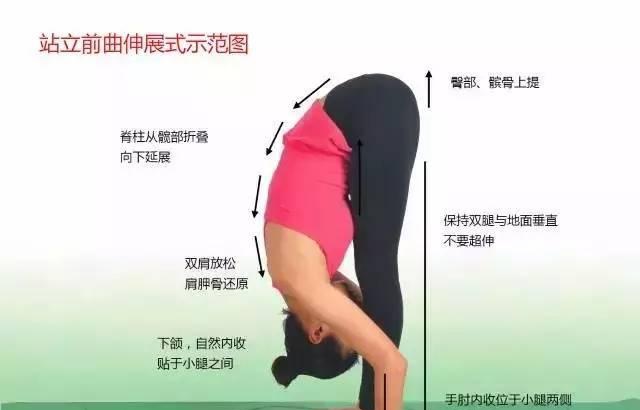 在该体式中,脊柱要从髋部开始折叠向下延伸,然后做到肩膀放松,而不是用肩部向下拉伸身体。同时,双腿不要因用力过大造成超伸的现象,如果身体柔韧性很好,双小臂应该是垂直于地面的。