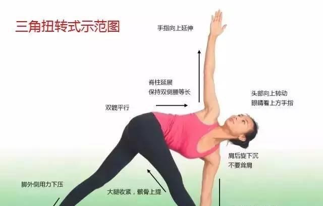 在三角式中,最需要注意的就是髋骨上提,脊柱延伸,保持双侧腰等长,向下的手臂放于脚掌外侧,肩部下沉,同时不要耸肩。