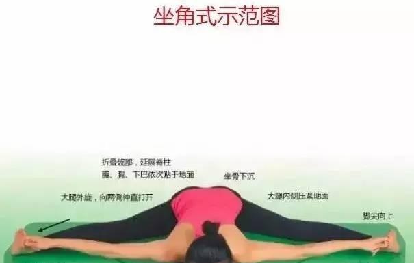 坐骨向下贴地,双脚踝向两侧推送的同时脚趾回勾,背部保持延展向下。大腿内侧压实地面,腹、胸、下巴依次贴于地面。