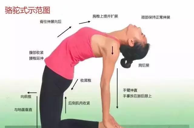 骆驼式中,大腿应与地面垂直,然后大腿前侧向前推,后侧肌肉收紧,脊柱应保持向后延展,而不是被挤压的感觉。颈部放松,同时双臂垂直于地面。