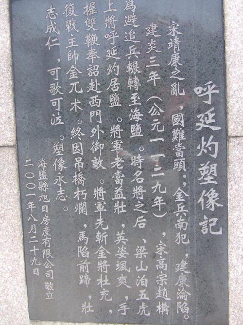 有时候历史和传说真的傻傻分不清楚,不管呼延灼是不是在海盐城为了保护皇帝而战死沙场,是否和这座城市有着不可分割的关系,其实又有什么关系呢,海盐人民放他的雕像纪念他,可能更多的纪念他的爱国护家,英勇御敌的气概和大义凛然的作风吧。