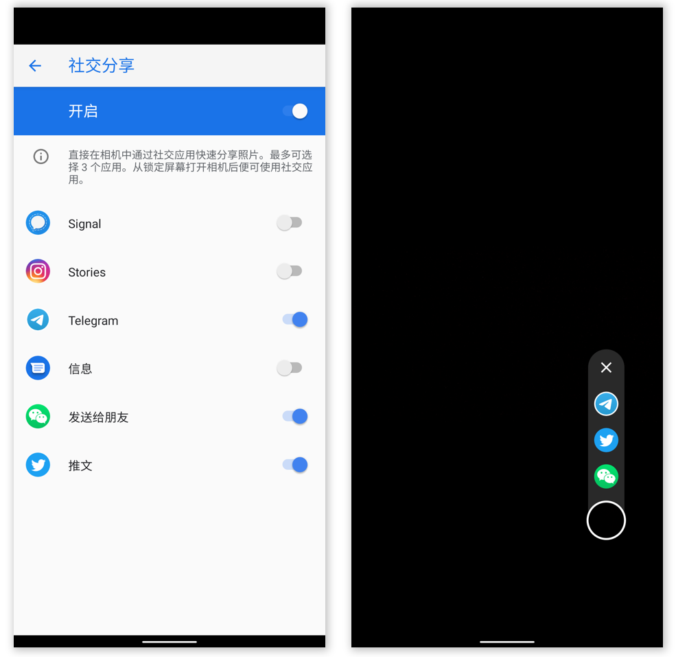 功能方面,Google Camera 7.1 版本还加入了快速社交分享,在相机设置中我们可以选择最多三个常用的社交分享方式,拍摄完成后直接根据照片预览上方的箭头提示上滑即可一键分享至对应平台;拍摄时如果手机握持方式不对,取景器还会出现水平仪来进行辅助。