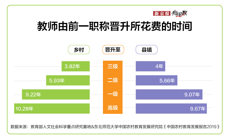 相较收入而言,有限的编制名额是乡村教师更大的压力。和城里的老师比起来,他们的职称晋升更难一些。尽管职业初期,乡村教师花费更少的时间升到了三级,但在更高的二级、一级、高级职称晋升中,乡村教师的步伐明显比县镇教师慢下来了。