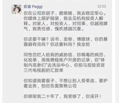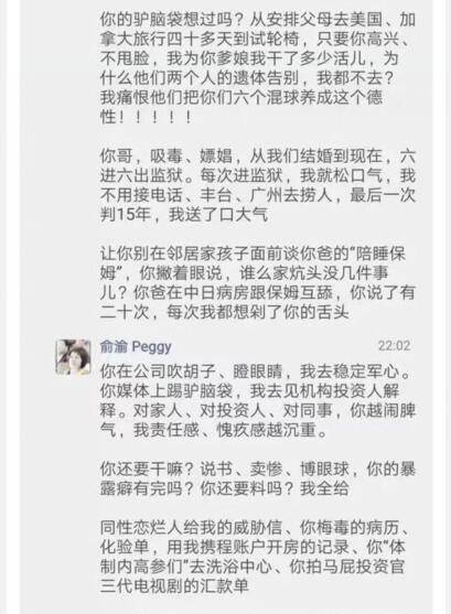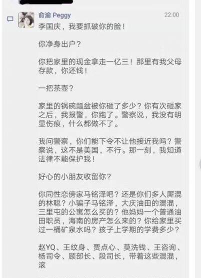 随后,李国庆朋友圈反击,称俞渝“狗急跳墙,工作撕逼虚构事实,私生活撕逼更是意淫。变态,精神病患者。我为儿子忍受了23年。”