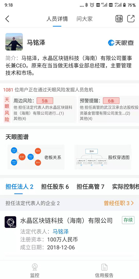 陈鸣并没有记错,马铭泽的确在李国庆投资过的一家公司任职。天眼查信息显示,马铭泽为原当当无线事业部总经理,主要管理技术和市场。目前其担任水晶区块链(海南)有限公司董事长兼CEO,并持股60%,当当创始人李国庆持股25%,是这家公司的第二大股东。