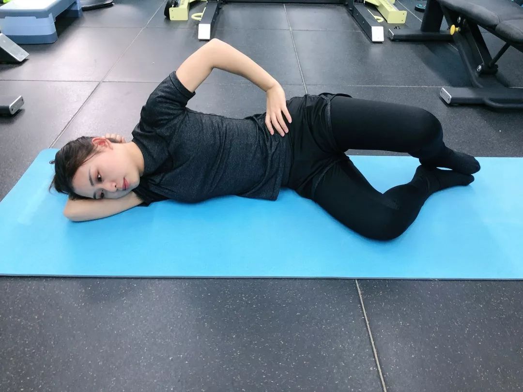 动作要领:取侧卧位,然后屈肘屈膝屈髋,保持头、肩、骨盆后侧以及脚后跟在同一直线上,如果看不到自己是否在同一直线上,可以靠墙。两眼目视前方,保持腹部收紧,轻微与地面有一点距离,两脚靠拢,然后抬一侧腿,抬到最大限度即可,最大限度即抬到使骨盆不能旋转,有轻微晃动时,然后恢复到初始位置,15个/组,2-3组,一侧做完换另一侧做,感受到臀后侧肌肉有酸的感觉为止。