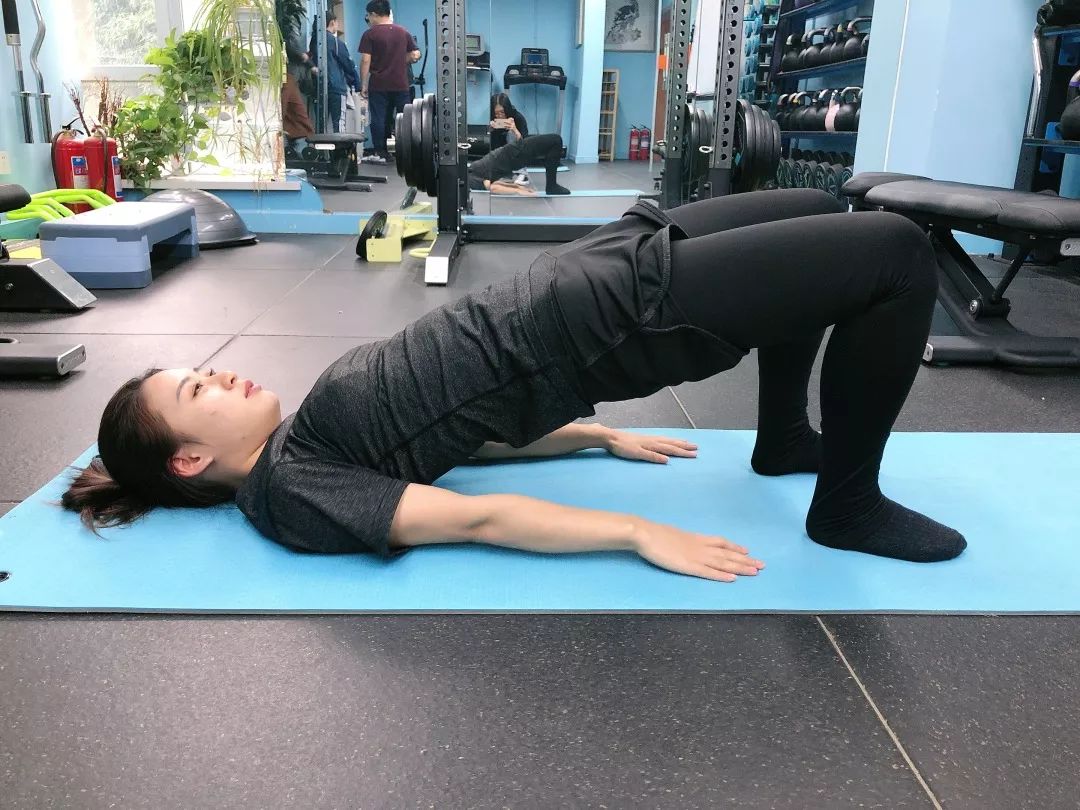动作要领:仰卧位,双手放于身体两侧,掌心向下,屈膝90度,双脚微分开,双脚平行,然后依靠臀肌的力量使骨盆慢慢卷起来,竖直向上抬起来,使肩、髋、膝保持在同一条直线上,保持15秒左右,然后回复到起始位置,2-3组。