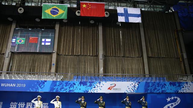 当日,第七届世界军人运动会空军五项男子团体赛颁奖仪式在武汉举行,中国队获得冠军。巴西队和芬兰队分获二三名。