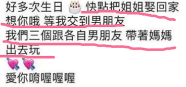 “快点把姐姐娶回家,想你我,等我交到男朋友,我们三个跟各自男朋友,带着妈妈出去玩。”这句话背后隐含的意思是,老二欧阳娜娜已经有男朋友了?