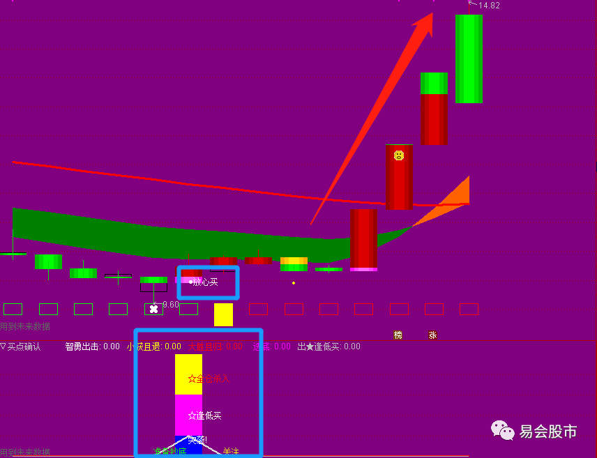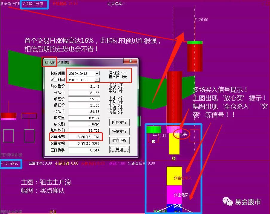 大家可以看到,同时出现主副图指标买入信号的时候,个股涨幅是多么恐怖,在高点还会提示撤退信号,是不可多得的入门性指标。实战: