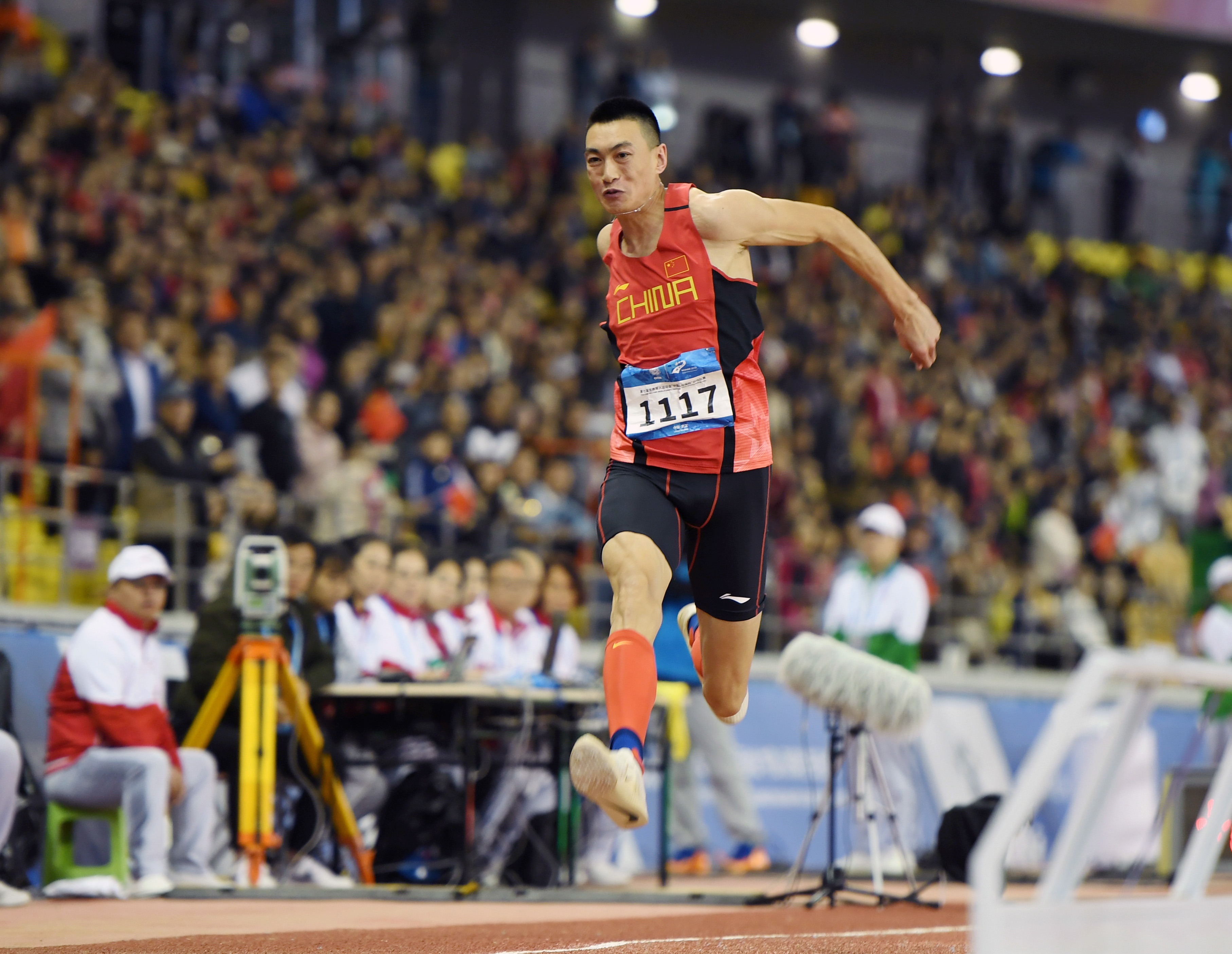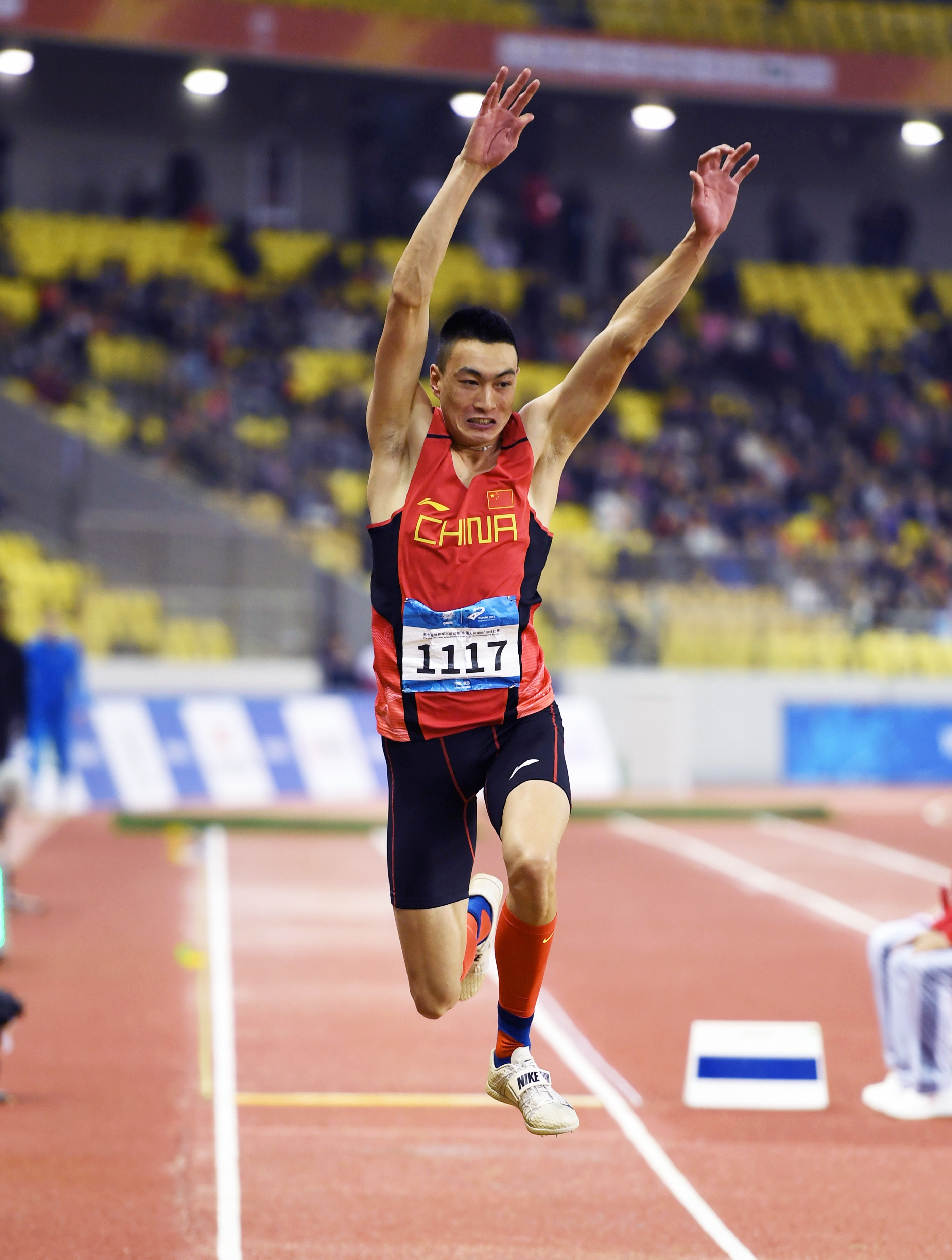 新华社照片,武汉,2019年10月26日 (军运会)(4)田径—-朱亚明获男子三级跳远冠军 10月26日,中国选手朱亚明在比赛中。 当日,在武汉举行的第七届世界军人运动会田径项目男子三级跳远决赛中,中国选手朱亚明以17米09的成绩获得冠军。 新华社记者范培珅摄