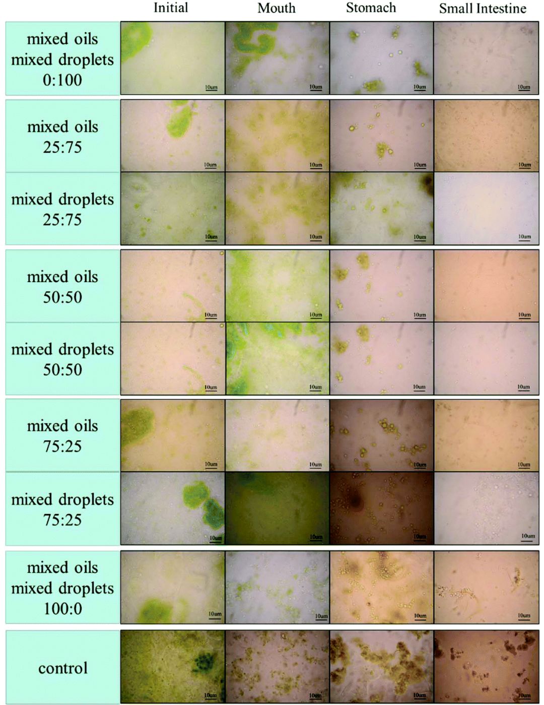 本研究主要探究了赋形剂纳米乳液油相组成对菠菜中类胡萝卜素的生物可利用率的影响, 其中油相组成分两种方式,一种是将中长链甘油三酯(MCT)和长链甘油三酯(LCT)先混合再均质,另一种是将MCT和LCT先分别均质再混合。使用静态胃肠道模拟消化评价油相组成对类胡萝卜素生物利用率的影响。