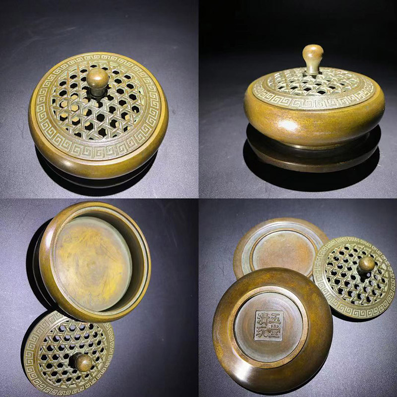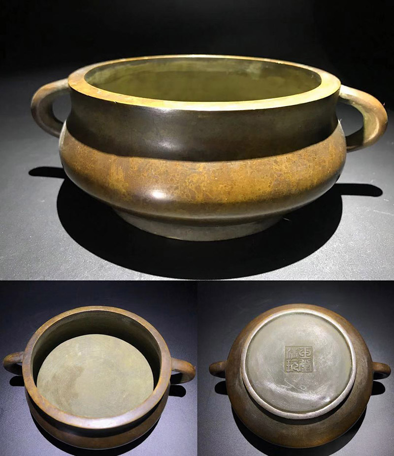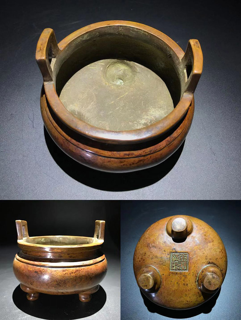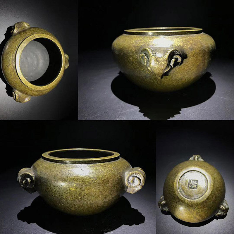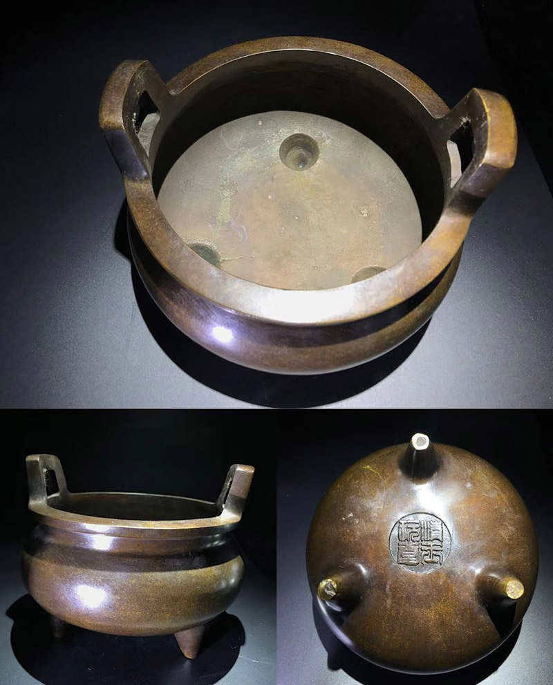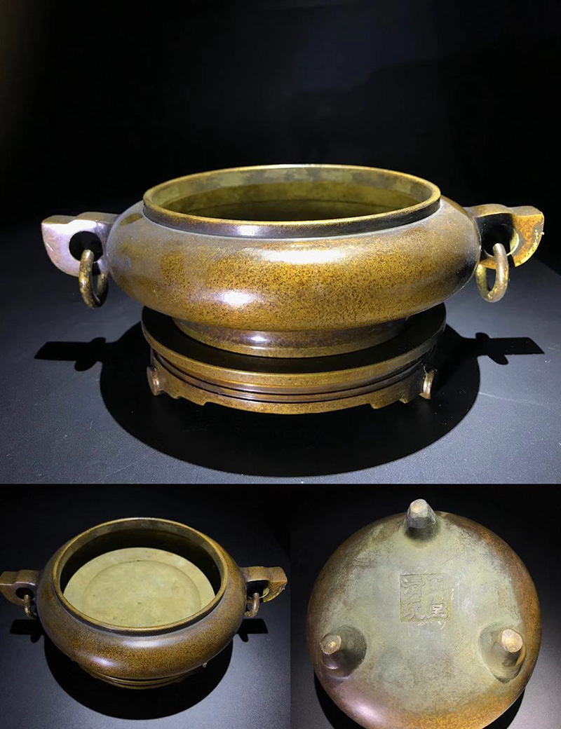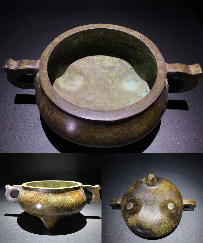 时间允许的情况下,可以给香炉加热来进行试验,“严炉”时期的“玉堂清玩”经热养一段时间后,香炉金光泛泛,珠光宝色,映出炫目效果,和其他炉并放对比有一枝独秀之感。真宣德炉用火养会产生绚丽多彩的效果,此炉也并不逊色宣德炉,所以有流传出来“玉堂清玩,比肩宣德”的感叹。