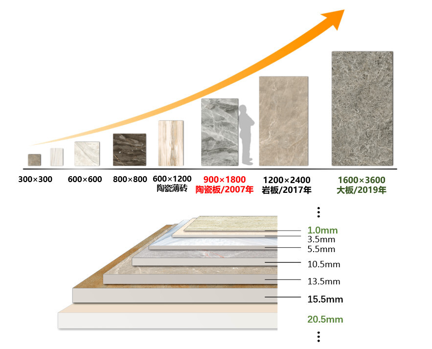 正是意识到技术自立的重要性,蒙娜丽莎在过去的十二年里,在工艺装备上进行不断创新,在渠道上不断开拓应用领域,蒙娜丽莎用技术硬实力协同上下游企业,自主研发设备,自主研制配方、突破核心技术难题,解决从配方、工艺、装备到包装、运输、施工等一系列问题,让陶瓷板这款产品真正地走进中国市场,并广泛应用起来。如今,中国陶瓷板已经突破原来1800mm×900mm的规格,推出2400mm×1200mm的大规格陶瓷板,而在2019年引进首台36000吨压机进行技术创新后,更推出了3600mm×1600mm超大规格陶瓷板,产品厚度亦从最初5.5mm到如今实现厚薄自如,已经突破传统墙地面应用,跨界到其他领域。