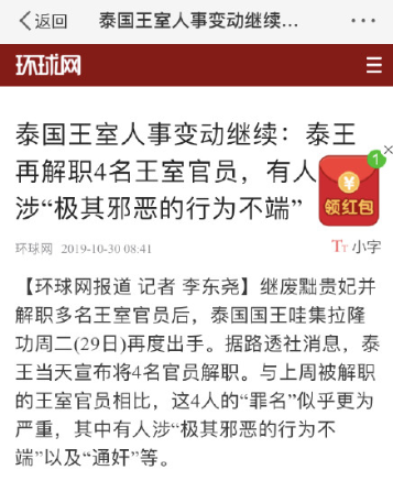今年10月22日,也就是上周二,泰国国王玛哈·哇集拉隆功剥夺王妃诗妮娜的所有皇室和军事头衔,因其“严重的不服从行为”,包括“对国王不忠”和“因个人野心违反王后苏提达命令”。尽管所有人都很好奇是怎么对国王不忠的,但王室没有公布。然而昨日,泰国王室再次罢免了4位官员,疑似就是贵妃私通的对象。