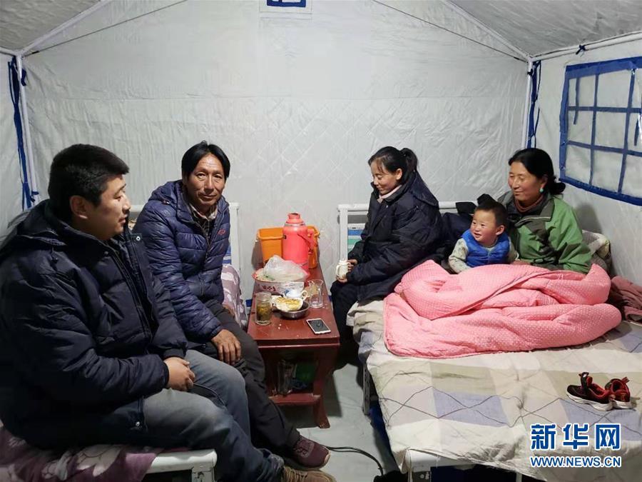10月28日,夏河县达麦乡受灾群众贡保当知一家在安置帐篷里用上了电褥子。新华社发