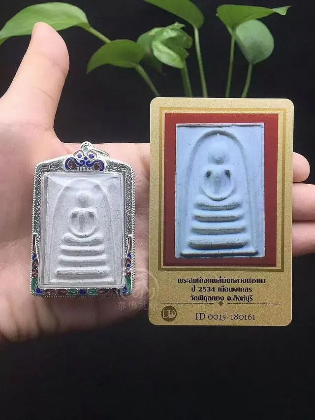 僧侣生涯知识与法力并重,成名极早,威望极高,现已圆寂。师傅的出名圣物便是崇迪,佛历2510的一喷崇迪、佛历2511的二喷崇迪、佛历2512的三喷崇迪基本上将龙婆培的崇迪推向了巅峰,此后的几年中师傅也屡屡做出屡出神迹的知名佛牌,如菩提叶崇迪、狮子座崇迪、伦成龙款崇迪、圣血崇迪等。不过就历史价值以及实效等方面综合评论的话,依然是喷系列崇迪中的前三喷最为殊胜。不过就事论事的说这些知名佛牌的市值不是一般善信可以接受的,所以龙婆培在佛历2534又做了喷系列的下两个版本,也就是四喷和五喷崇迪。喷的意思,就是千的意思,四喷就是制作了四千尊的意思,五喷就是制作了五千尊的意思。龙婆培佛历2534五喷崇迪佛牌,距今23年的历史,佛牌以花粉、香灰、庙土、老牌碎、塔固等材质制作,同期还有黑色的经灰版本,同时还有分贴金与不贴金的,以及彩泥的版本,不过市值却没有什么太大的差异。佛牌的尺寸属于偏大一些的中模,厚度较大。正面为三层法座崇迪法相,背面是龙婆培的半身侧脸像,寺庙印记,龙婆培常用的人缘符文,以及泰文介绍,特别是泰文数字,表示了这个崇迪的版本。龙婆培是近代崇迪制作数一数二的师傅,他的崇迪认可极高,与佩戴者一定程度的提升。