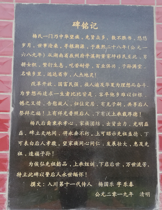 吾袓胜晚、秀富父子奉旨由湖南省辰州府平溪衙董家坪(今湖南省怀化市沅陵县“详细地点有待考察”)移四川省岳池县西板乡生溪沟定居,至今三百三十余年,子孙连绵后继有人。
