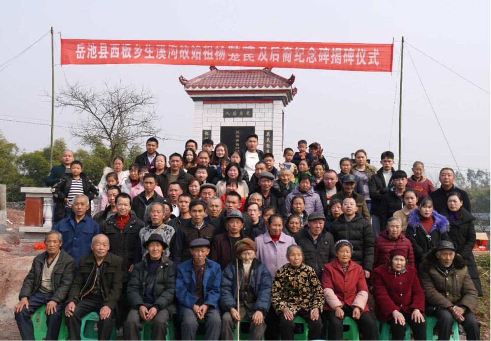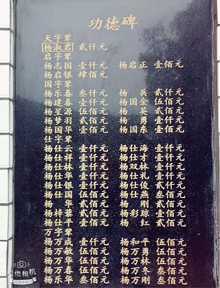 2015年清明会,宗亲汇集祭祖时,商议我族大事。一是原清明会主持及成员年纪已高,不便组织和主持相关事宜,一致同意换届,经推荐和推选,杨勇当选为:岳池县西板乡生溪沟杨氏宗族清明理事会会长,理事会成员有:杨国俊、杨星源、杨仕海、杨仕云、杨万成。二是同意重建纪念碑,与会当场,捐款金额就达到了一万多元。经过多次选址,最终将重建纪念碑的地址选定在了原合作社保管室处,占地40余平方米。此地为杨星源自留地,衷心感谢他无偿的将此地奉献出来,用于重建纪念碑,这种无私的奉献精神值得我们学习、发扬和敬佩!
