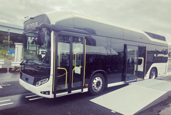 燃料电池巴士Sora:单词中的四个字母分别代表天空、海洋、河流和空气,彰显着产品的环保理念,该车的动力源是10个60L的氢气罐,并配备了一块镍氢电池以应对紧急措施。车辆本身安装了22个座位以及足够56人站立的空间,座椅可根据要求进行折叠,为婴儿车或者轮椅提供空间。