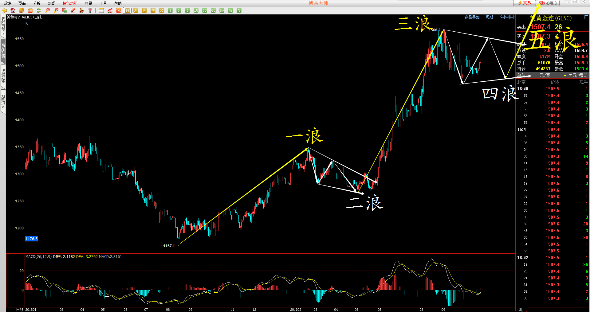 黄金近一年以来一直处于推动浪之中,目前看已经走到了四浪调整当中。由于二浪出现的内部结构为锯齿形,按照“二浪四浪调整交替理论”,四浪的形态出现三角形或矩形的概率很大,当然这两种形态的波动区间还是比较相近的,唯一的区别在于形态最后的末端会出现不同的结束信号,和新的趋势开始的信号。其中三角形可以看到ABCDE的33333结构,矩形可以看到ABC的335结构。后期一旦四浪调整结束将会进入到最后一波主升五浪中。按照“一浪和五浪等长的理论“,五浪最终的目标将会突破1566,去到1640附近最终结束。因此现在我们只需要耐心等到四浪调整的结束,然后全身心的参与到五浪的滚滚红利中去。