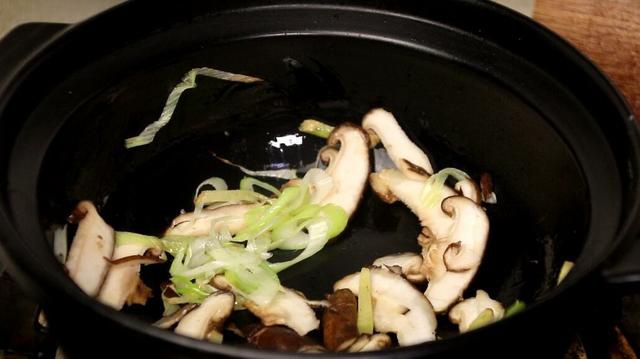 4、烹饪食材:砂锅里面放点油,放葱姜炒一下,放入香菇,少放点生抽,放洋葱,然后放入炸好的鱼块