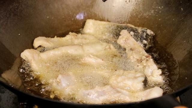 3、炸鱼块:锅中烧油,烧至五成热,放入鱼块炸一下,将鱼炸至金黄捞出来