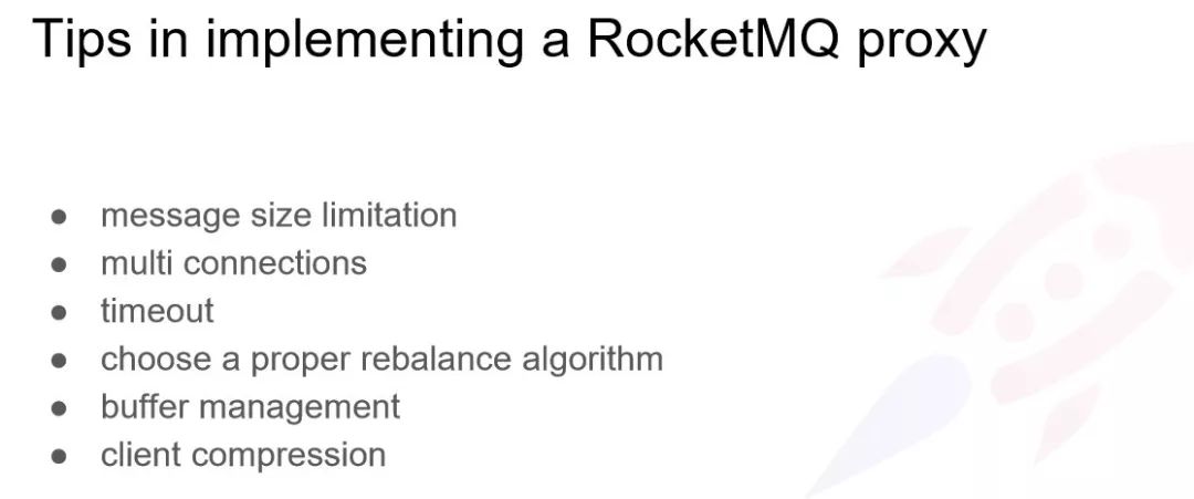 特别提醒一下, Proxy 拉消息都是通过 Slave 去拉,不需要使用 Master 去拉, Master 的 IO 比较重; 还有 Buffer 的管理,我们是遇到过这种问题的,如果只考虑 Message 数量的话,会导致 OOM ,所以要注意消息 size 的设置,