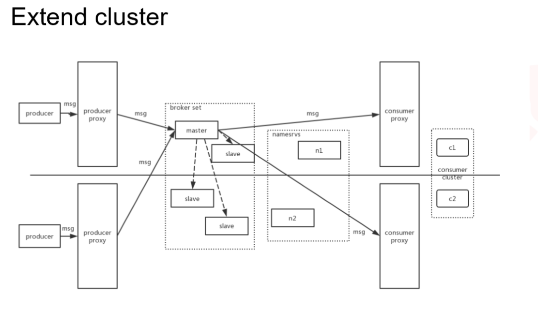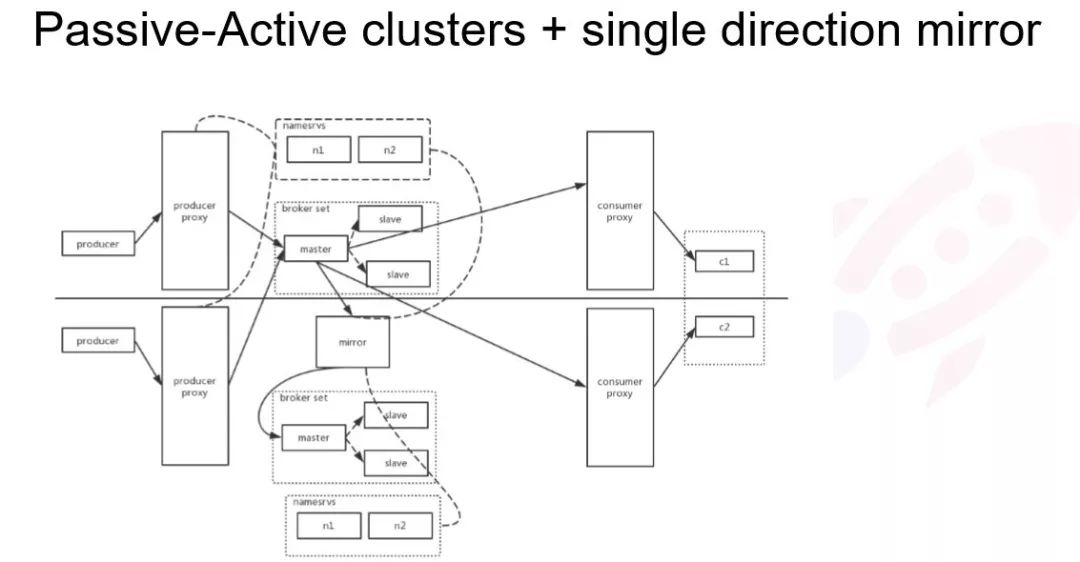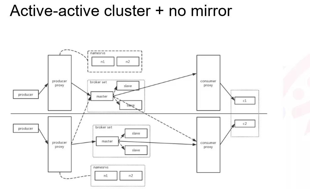 这是 master 和 slave 跨机房去部署的方式。 因为我们有一层 proxy ,所以可以很方便的去做流量的调度,让消息只在一个主机房进行消息写入,不需要一个类似中控功能的实体存在。