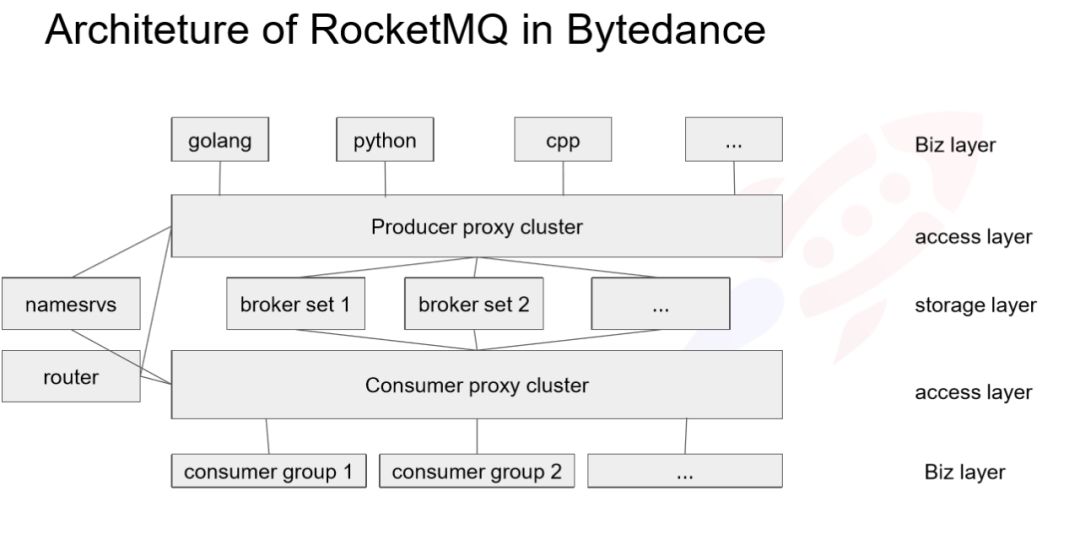 今日头条的服务大量使用微服务,容器数目巨大,业务线繁多, Topic 的数量也非常多。 另外,使用的语言比较繁杂,包括 Python,Go, C++, Java, JS 等,对于基础组件的接入,维护 SDK 的成本很高。