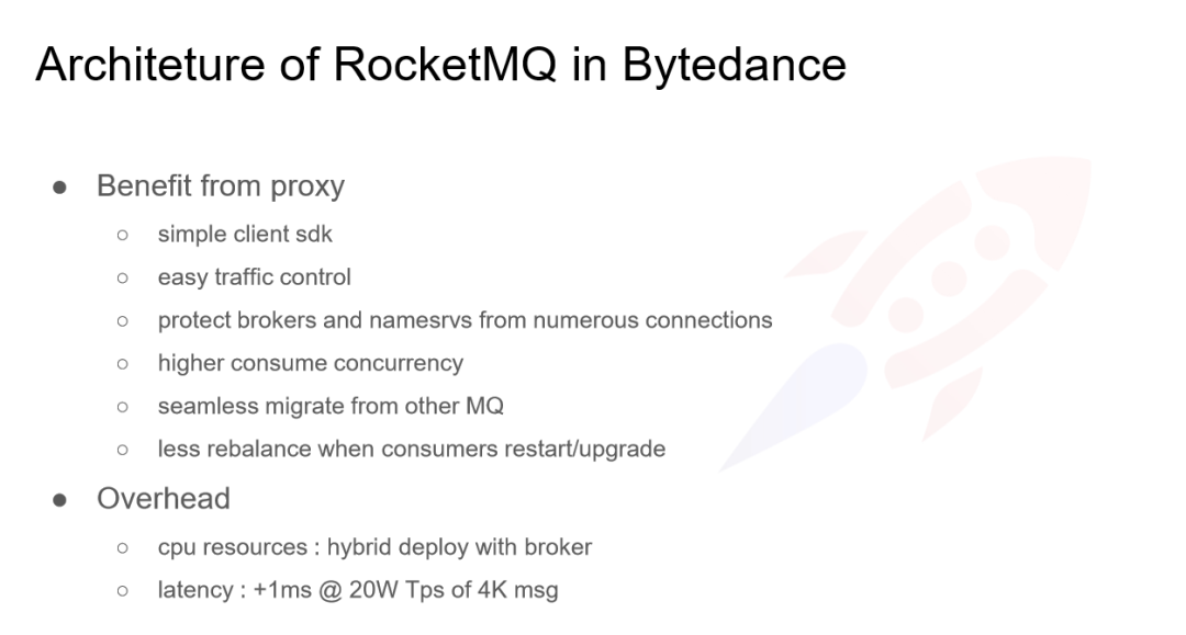 以上是我们通过 Proxy 接口给 RocketMQ 带来的好处。 因为多了一层,也会带来额外的 Overhead 的,如下: