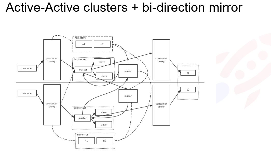 第三种方案: 双写加双向复制的架构。 这个结构太复杂不好控制,尤其是双向复制,其中消息区回环的问题比较好解决,只需针对在每个正常的业务消息,在 Header 里加一个标志字段就好,另外的 Mirror 发现有这个字段就把这条消息直接丢掉即可。 这个链路上维护复杂而且存在数据冗余,其中最大问题是两边的数据不对等,在一边挂掉情况下,对于一些无法接受数据不一致的是有问题的。