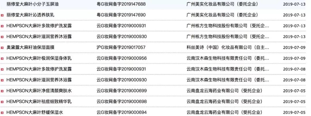 早在2015年12月23日,国家药监局发布的《已使用化妆品原料名称目录(2015版)》,就将大麻仁果、大麻籽油、大麻叶提取物列入已使用化妆品原料名单里。