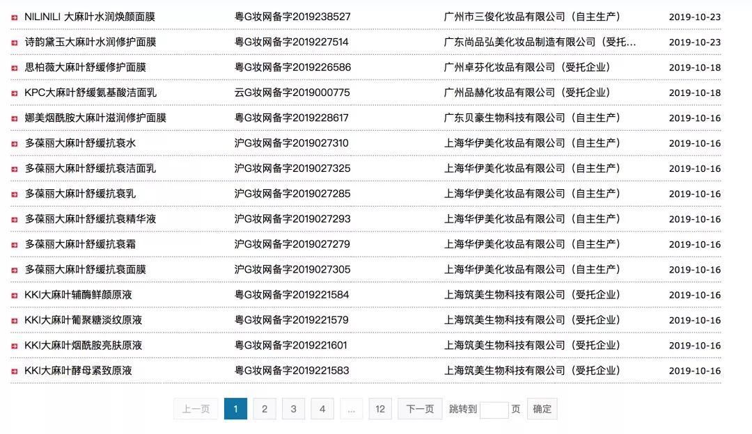 在药监局非特化妆品备案平台上,可以看到,与“大麻”关键词相关的备案化妆品计有200余条。
