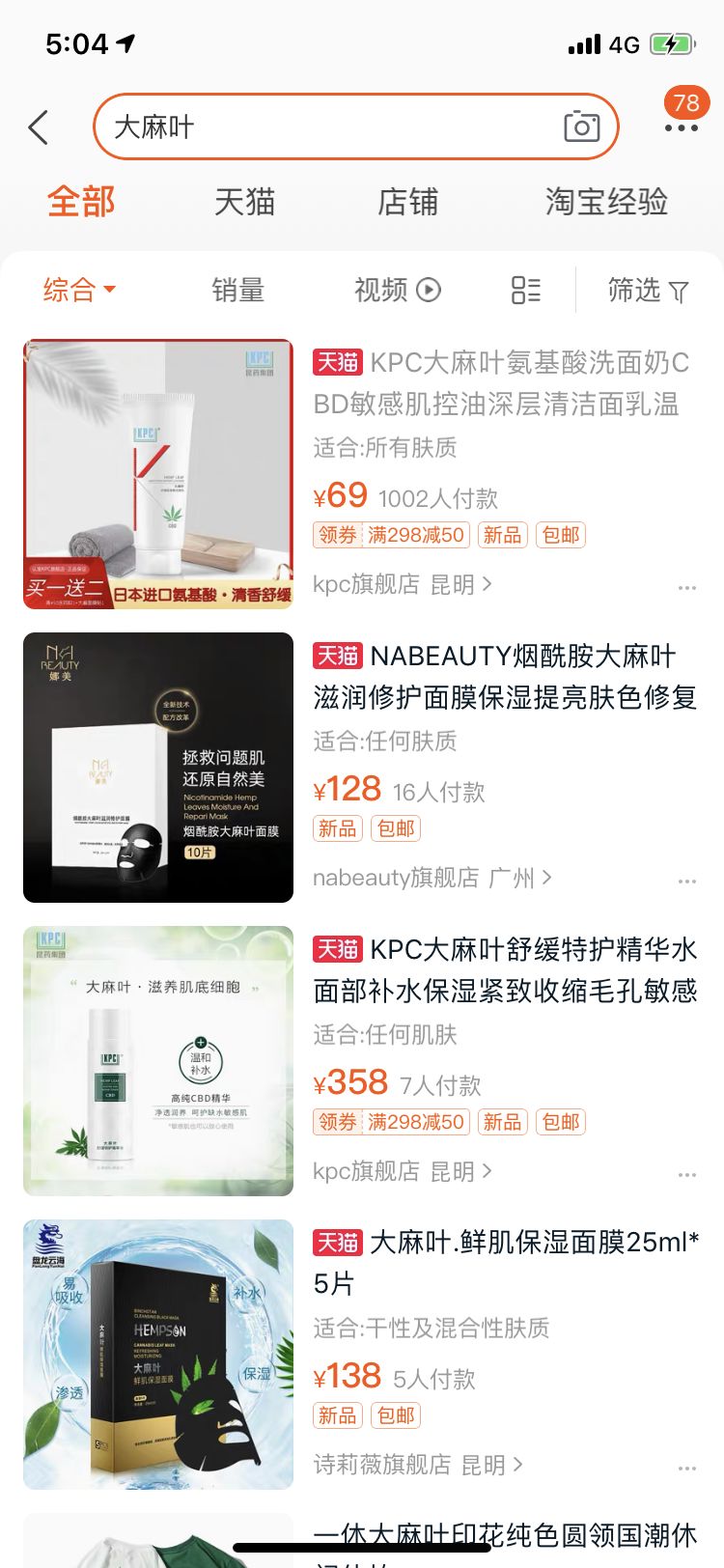 在电商网站淘宝、天猫、京东上也有不少以“大麻叶”为卖点的护肤品牌,除了昆药旗下KPC品牌的一款大麻叶洗面奶之外(天猫月销2000多瓶),其他品牌的销量都不甚理想。
