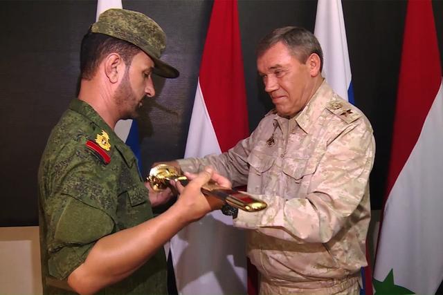2017年8月,俄罗斯国防部长谢尔盖·绍伊古授于哈桑感谢信和长剑。