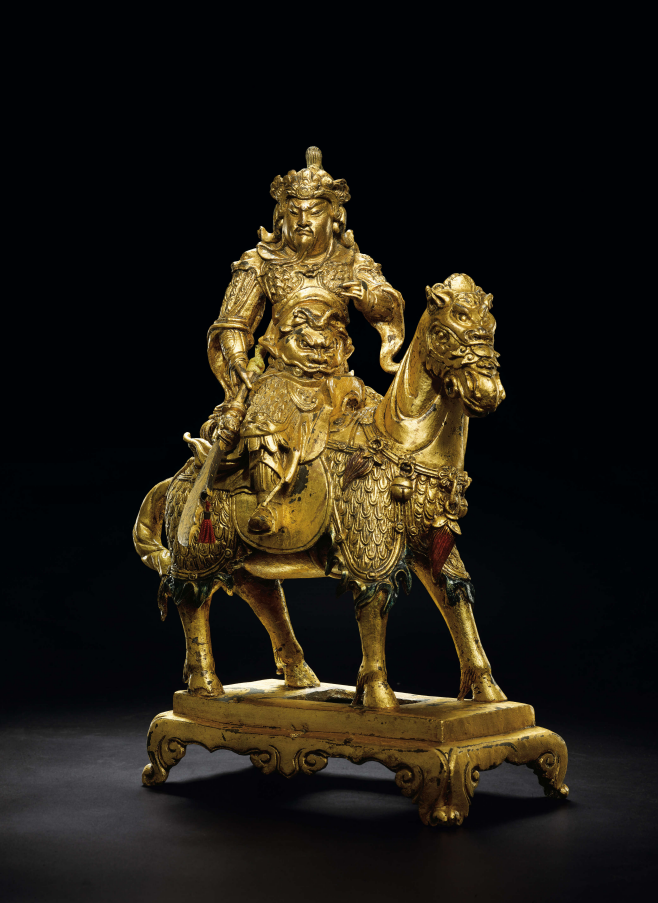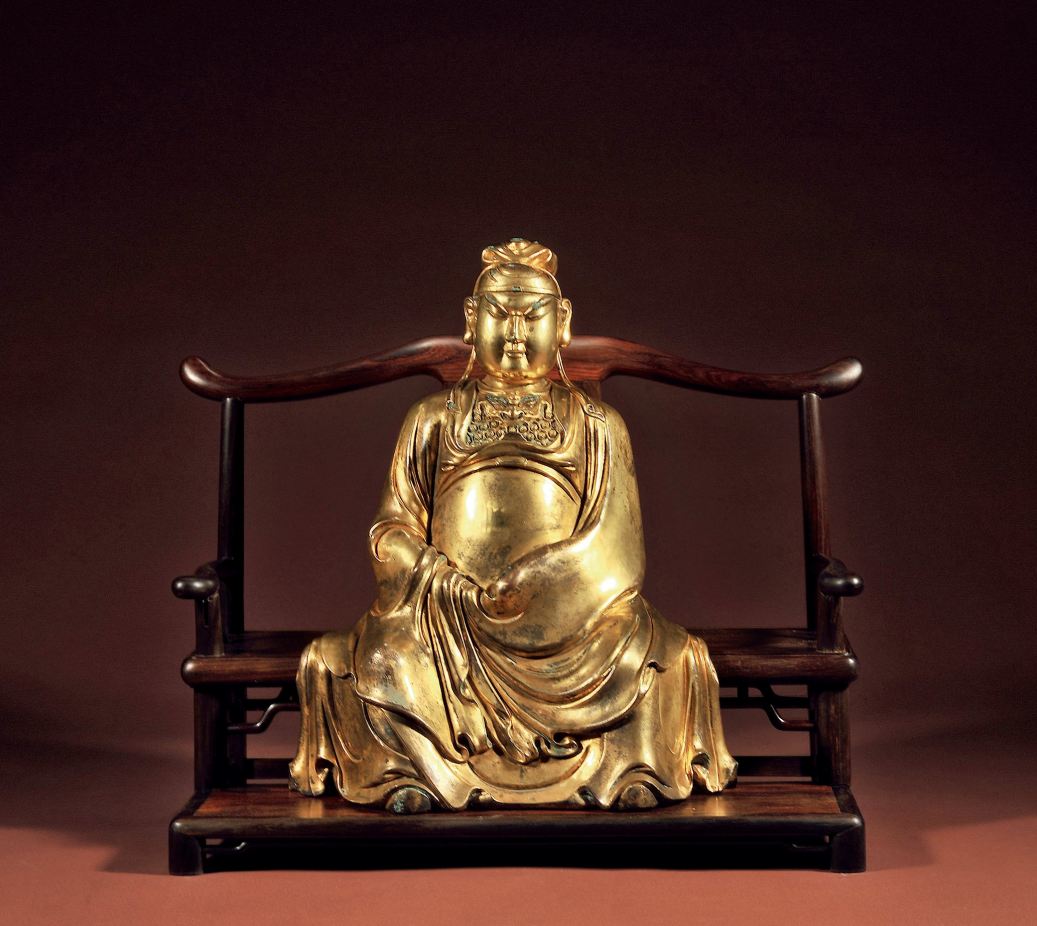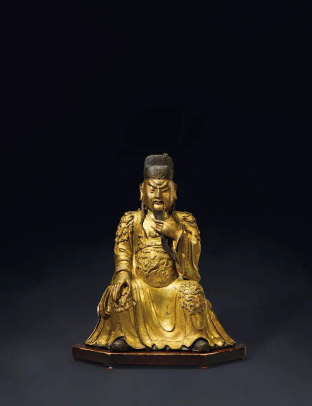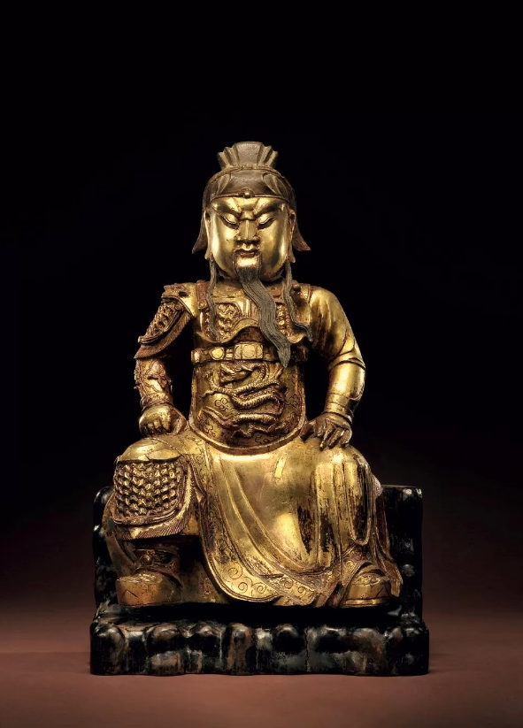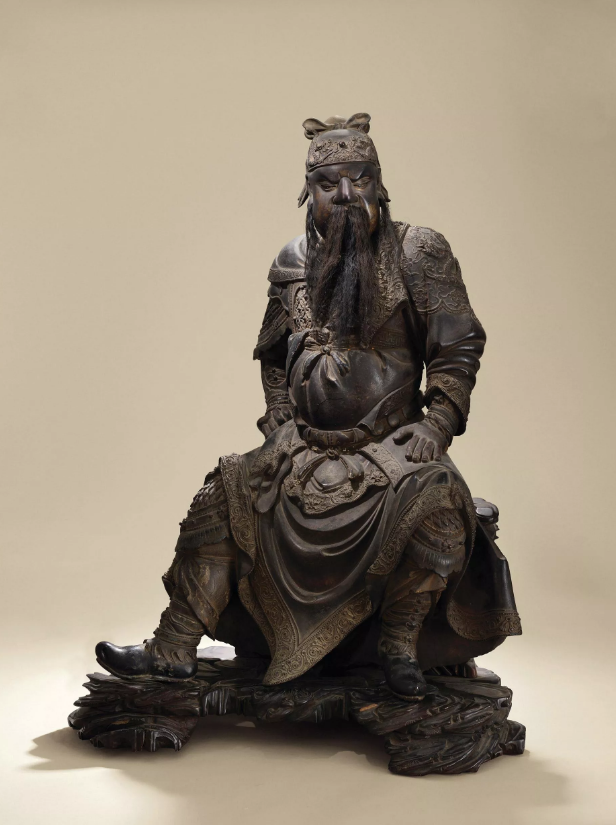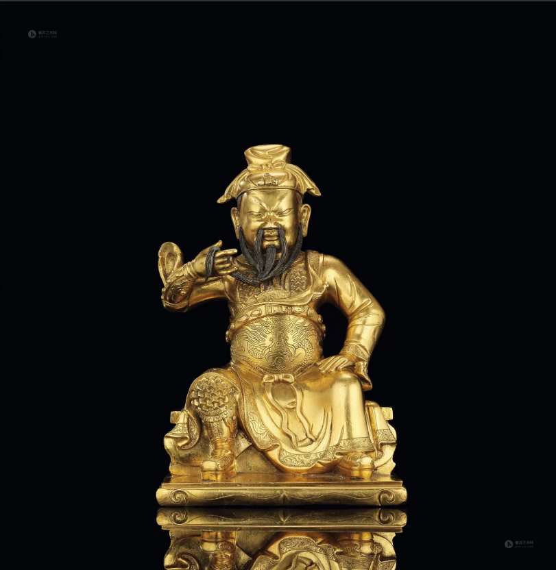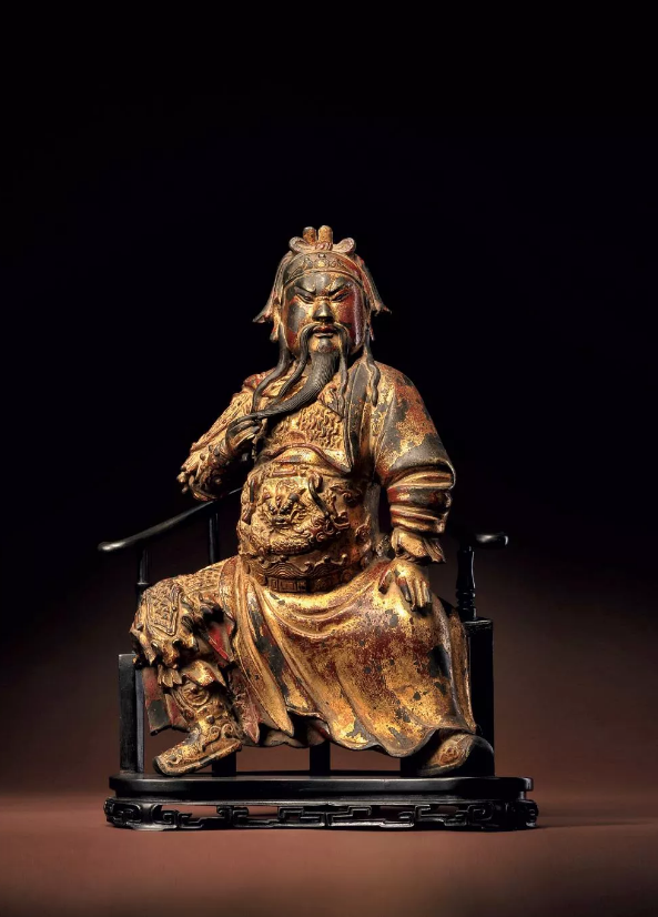 此尊明早期御制漆金彩绘铜关帝坐像为历代皆极为少见的御制关帝造像标准样式,各大公私收藏及海内外拍卖中均极为罕见,应是已知体量最大的铜坐像之一,既可作为关帝这一艺术题材在明早期的补白,亦是汉传宗教造像体系中极富代表性的宫廷雕塑杰作。其为日本山中商会1902年购入,后售予美国伊莎贝拉•嘉纳艺术博物馆,1993年由纽约佳士得释出后,由十面灵壁山居宝藏至今,来源清晰、流传有绪,为关帝造像问鼎之作。