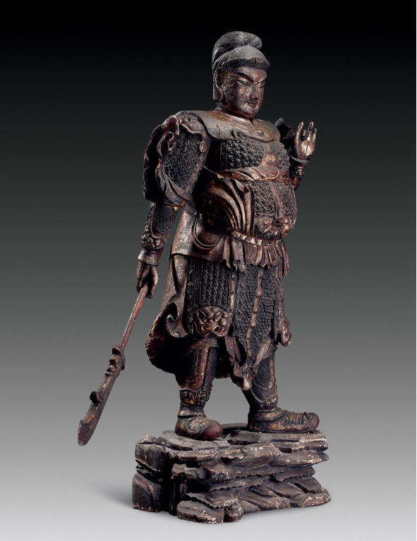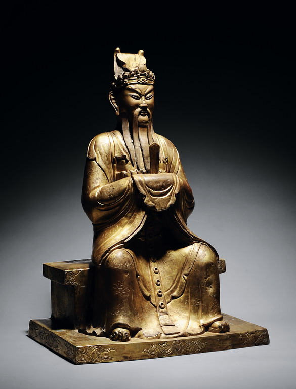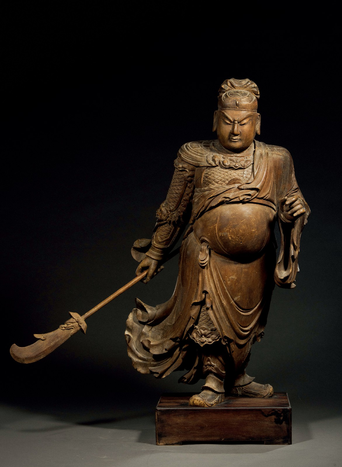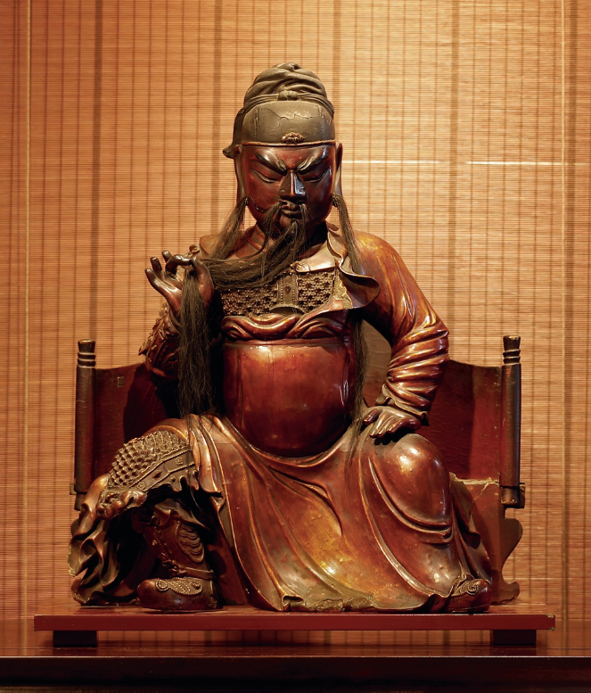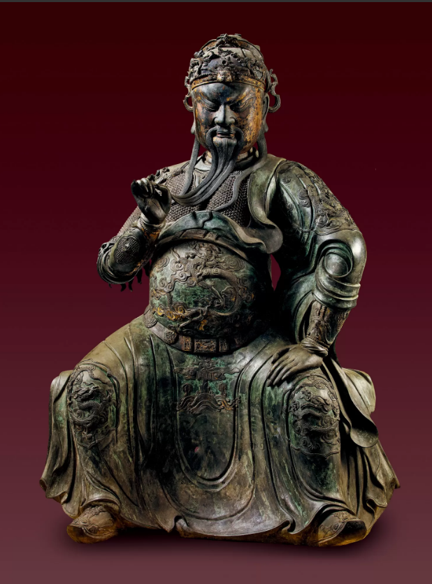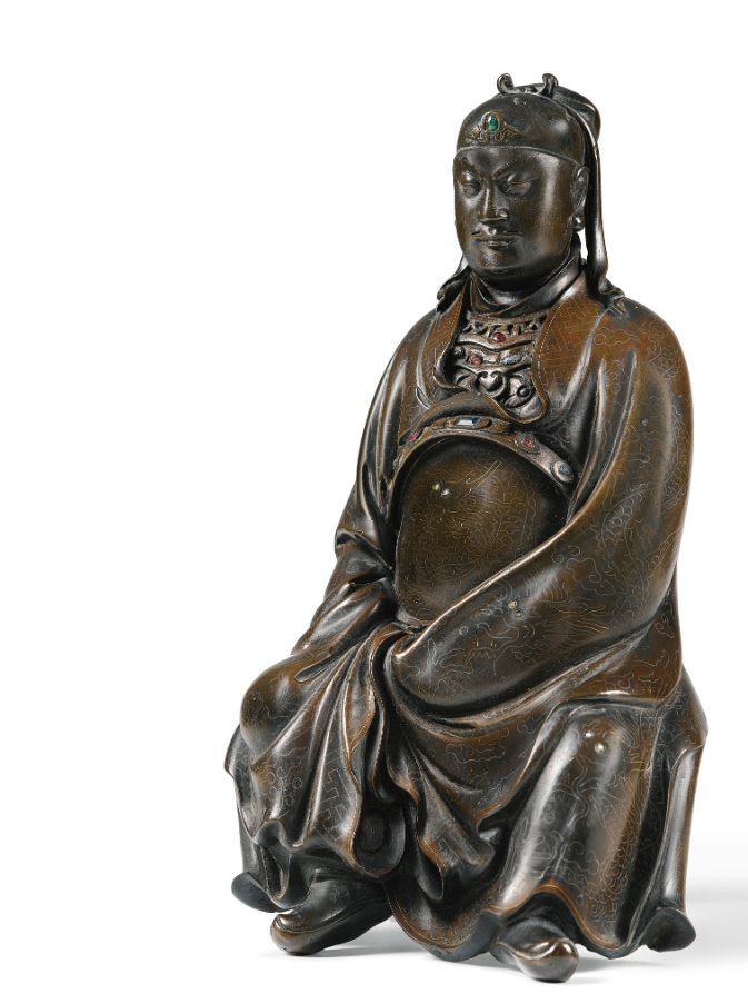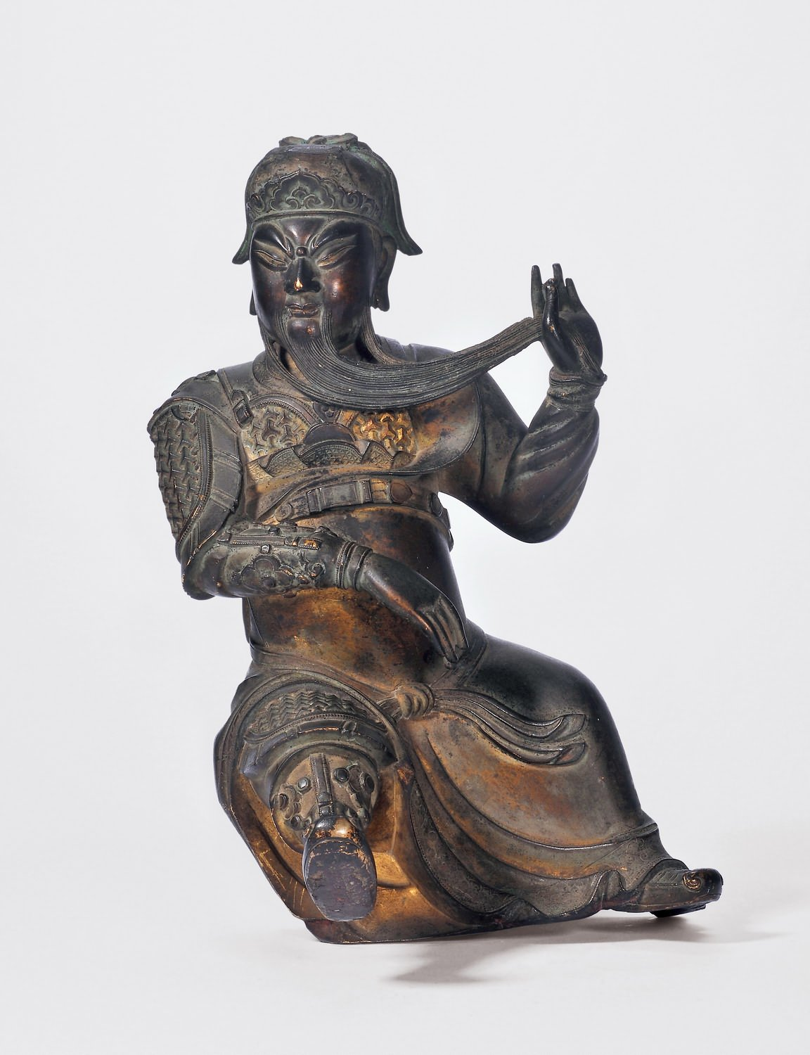此尊明早期御制漆金彩绘铜关帝坐像为历代皆极为少见的御制关帝造像标准样式,各大公私收藏及海内外拍卖中均极为罕见,应是已知体量最大的铜坐像之一,既可作为关帝这一艺术题材在明早期的补白,亦是汉传宗教造像体系中极富代表性的宫廷雕塑杰作。其为日本山中商会1902年购入,后售予美国伊莎贝拉•嘉纳艺术博物馆,1993年由纽约佳士得释出后,由十面灵壁山居宝藏至今,来源清晰、流传有绪,为关帝造像问鼎之作。