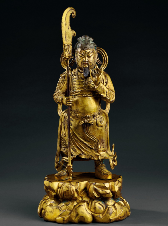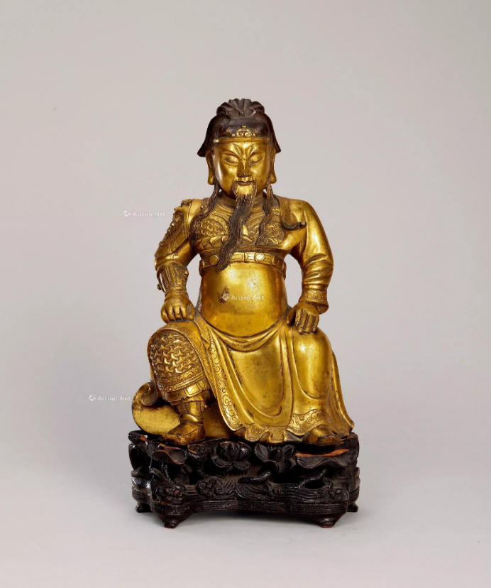 整像通体鎏金光灿,制作工艺精美,姿态生动有力,衣纹细腻流畅,技法精湛娴熟,细部雕刻纹饰一丝不苟,是清中期内地关公造像中的代表作。