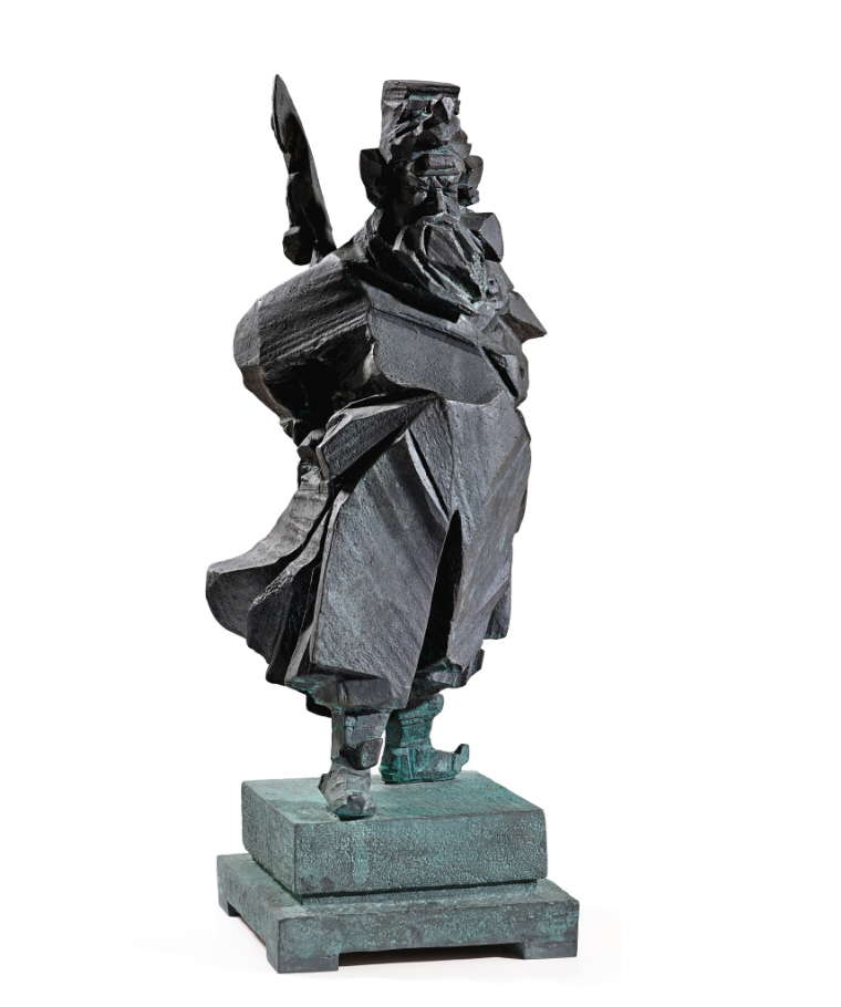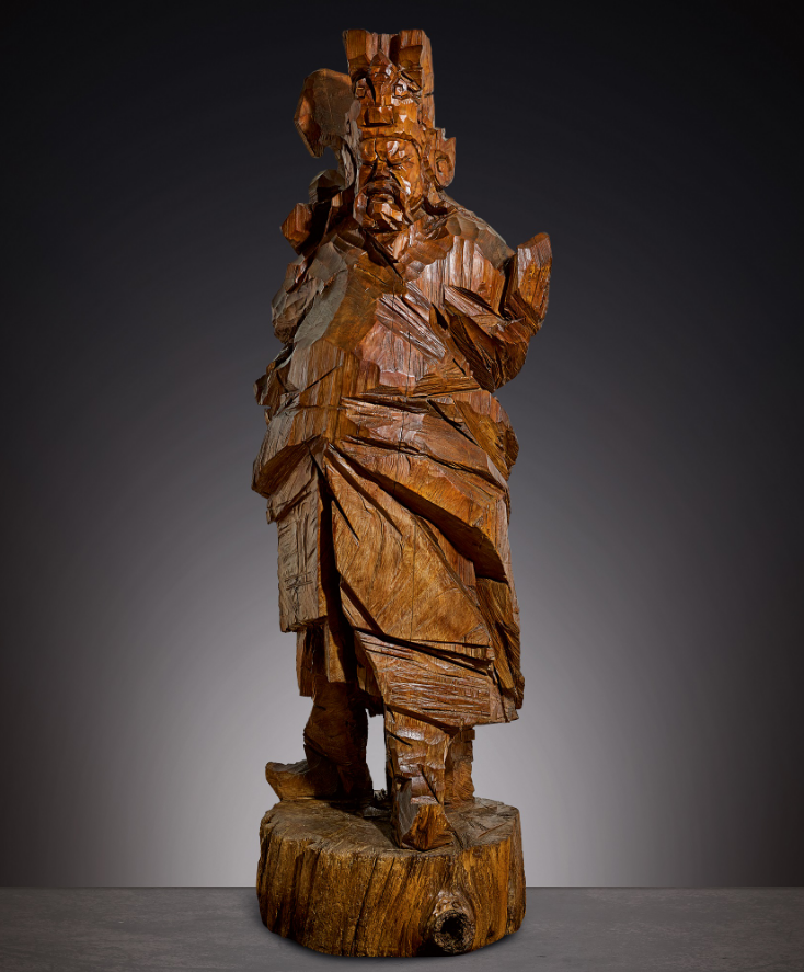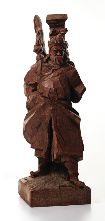 朱铭以庙宇雕匠出身,自青少年时期即拜台湾名匠李金川为师,习得一手娴熟的传统雕刻工艺;关公作为福建、台湾一带的重要信仰,对于艺术家而言可谓最熟悉的主题。本座《关公》蚕眉深锁、凤眼紧闭,似在沉思内观,予人高深莫测之感;其脸如重枣、美髯飞扬,面容不怒自威,让人心生敬仰;为了强化关公形象,艺术家通过高耸的巾帻突显其身高与威武,背后的青龙偃月刀收敛锋芒,笔直伫立,寓意保境安民,止戈为武,突显守护神的形象。