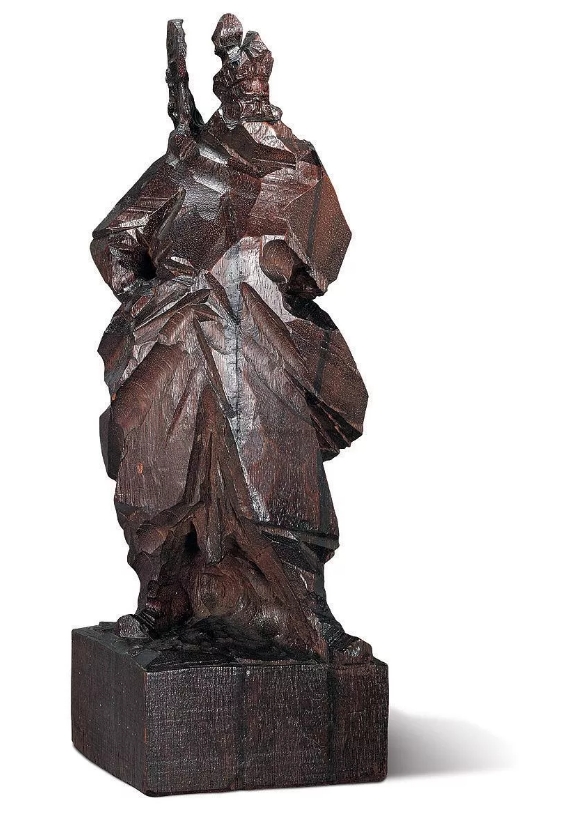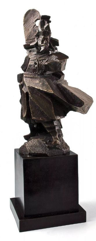 这是当今著名雕塑家朱铭早期“乡土系列”的一件木雕作品,他以简洁利落的刀法,浑然天成的形态呈现中国传统文化中忠义的化身——关公。在20世纪七、八十年代,朱铭多取材于台湾民风民俗,从乡间的水牛到乡民的劳作,还有儿时历史书里的孔子、关公、鲁智深等形象。朱铭的这批作品,充分保留了传统木雕刀法的趣味,人物在似与不似之间,以简洁的造型利落呈现,一如中国的简笔水墨画,含蓄中自有深韵。在表现手法上却大刀阔斧,线条粗犷,已显露出他日后充满爆发力的艺术风格的雏形。