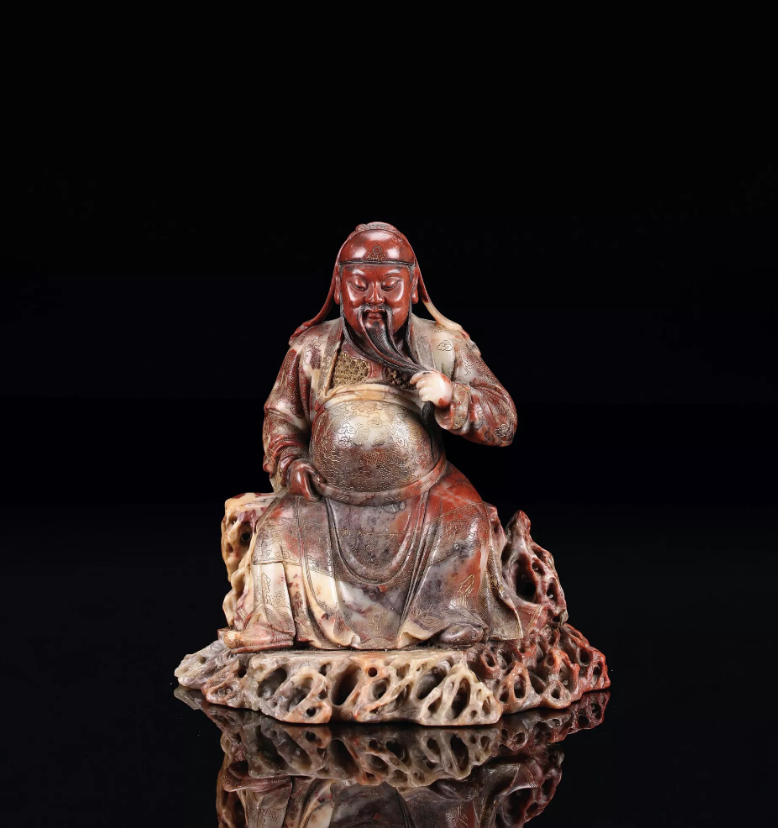 关公像通体以寿山石雕刻而成。质地滋润,包浆浓郁。寿山石是我国传统的“四大名石”之一。此立体圆雕关公坐像,为寿山石中佳品。关公带文帽,借石色雕赤面如枣,面容威严,三尺美髯垂胸而以左手握之。关公身披长衫,上衣窄袖贴身,线条流畅自然,贴身而落,衣裳纹饰繁多,四合如意云纹之中盘龙隐现。下裳带膝襕,纹饰与上衣相同,下摆处有海水江崖纹,纹饰尊贵,尽显其地位。右手扶须,左手自然放于腰带之上,坐姿舒展,座于山岩奇石之上,山石镂空。整体造型生动刻画准确,刀法熟练,真乃名家名作之风范。