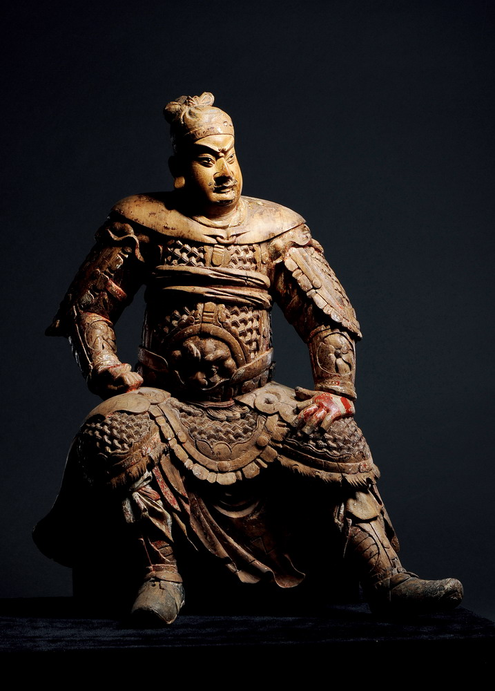 此尊关公坐像高75厘米,典型的明代山西工艺。关公身穿战袍,顶戴青巾皂角帽,肩披英雄巾,足蹬战靴。左手扶膝,右手握拳驻立腿上,身体微侧,威风凛凛。关公的面容刻画极为生动,浓眉交蹙,凤目微合,挺鼻丰唇,双耳肥硕,眉宇之间英气飒爽,表情威武凛然,尽显“忠义”之势。