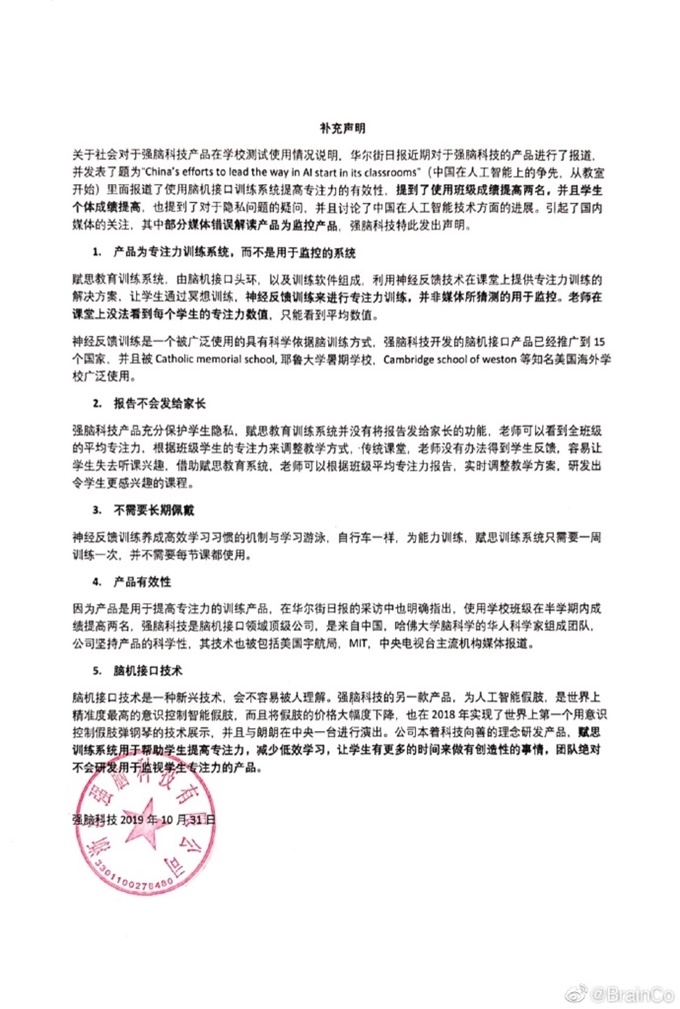 此外,该公司在数据隐私政策方面缺乏透明度。BrainCo在最近回应“监控学生”的声明中也只是表示:“我们一定会坚持‘科技向善’,坚持科技研发和应用的正当性、数据隐私保护等核心原则,也愿意接受社会的广泛建议和监督”、“赋思教育训练系统并没有将报告发给家长的功能”,并未提到该公司具体将采用何种方法保护学生的数据隐私。