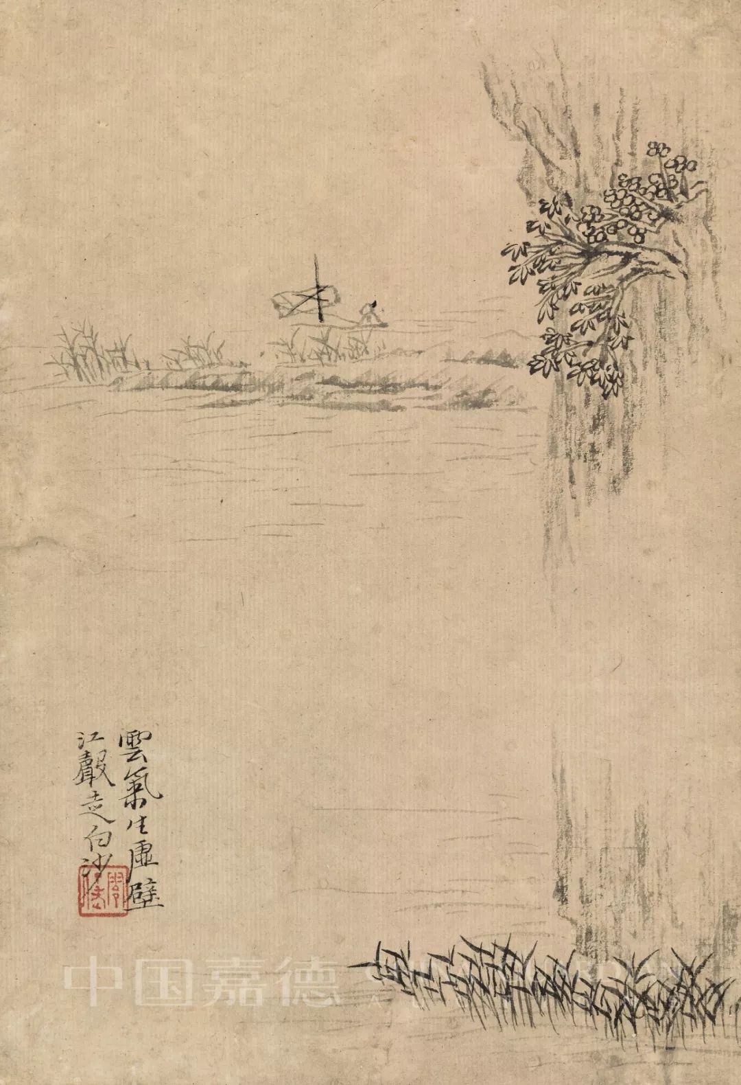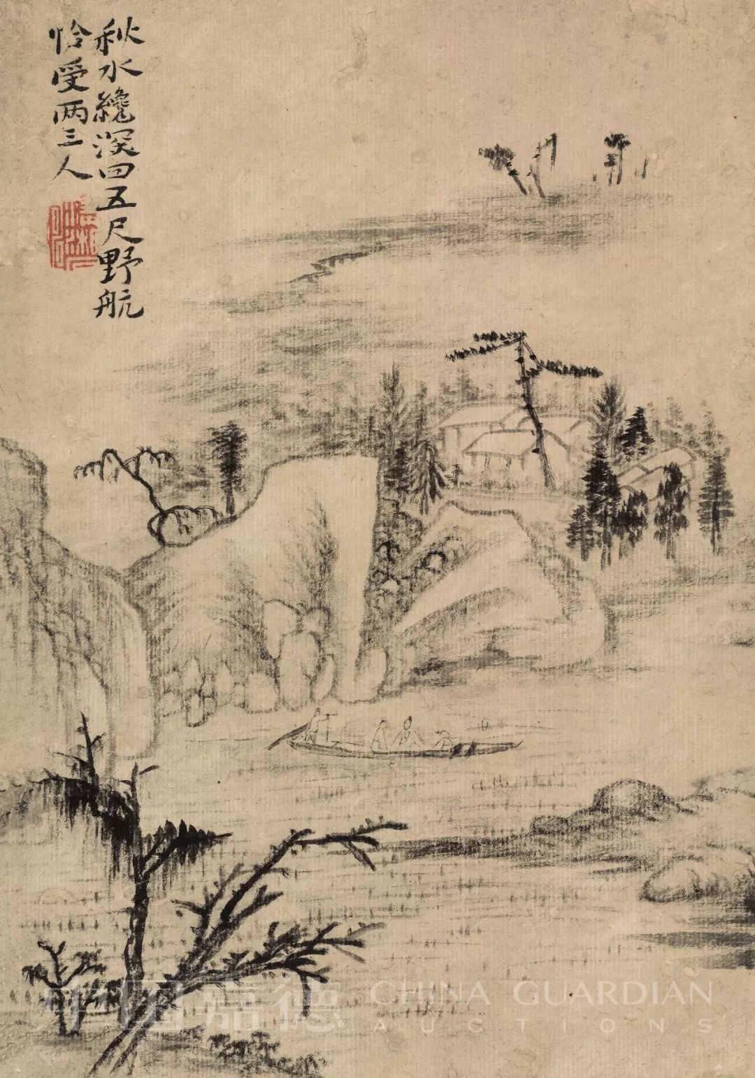因为秋雨乍过,近处小溪水面显然涨了数尺,水草被淹得只露出尖梢了。趁着水涨,几个高士相约泛舟荡漾于清溪之上,人物画得很淡很轻,仿佛云影的折射、水光的返照让他们变得更虚灵了。画中坡岸砂石都用渴笔轻勾淡擦写出,唯几棵秋树与乔松用焦墨重笔,于是全图精神跃出。在恍恍惚惚中让人感受到秋光闪烁之美。