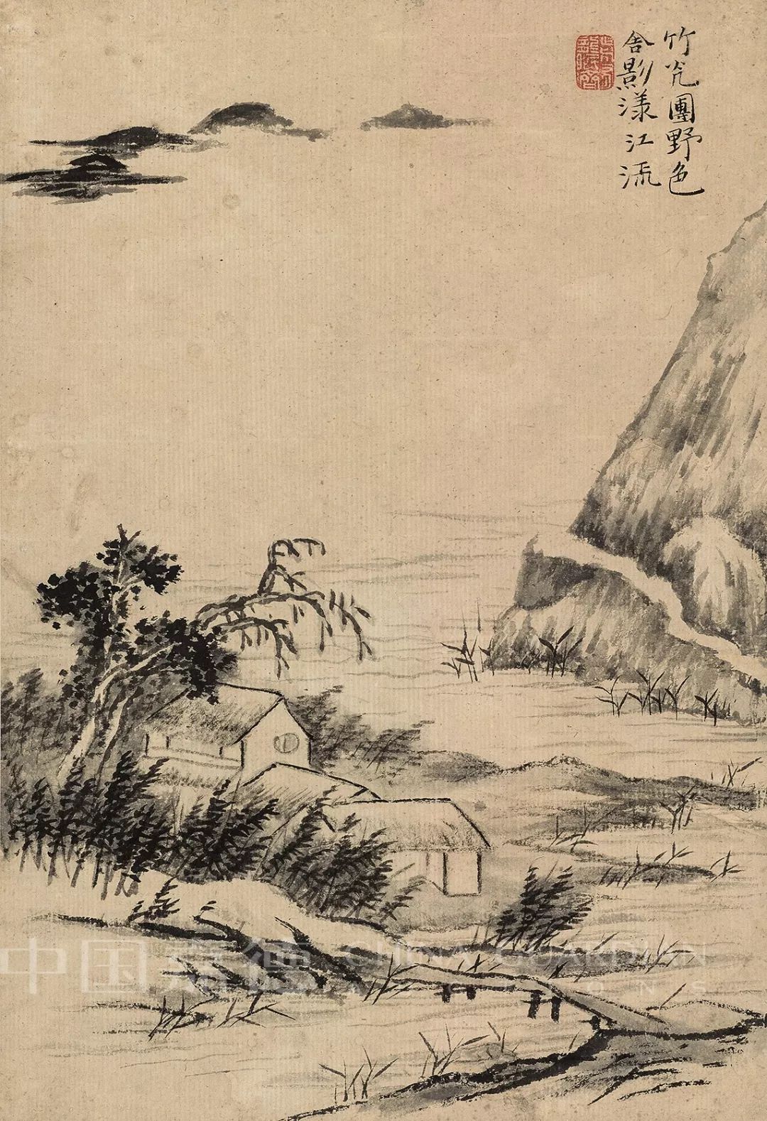 第五开,近处画小溪经过浅坡、板桥,绕过山隈汇入大江。坡陀之间,有茅舍隐于密篠乔柯之间。远处大江空阔,青山如卧。画中杳无人影,江上亦不见片帆轻舟,唯摇动的翠竹与迎风的芦叶打破了这地老天荒的寂静。画笔浓淡生发,枯湿并施,以活泼的笔墨来震动这冷寂的世界,尤见奇致。石涛心中郁郁向上的情韵,总时不时会流露于笔底。他欣赏倪云林,称赞他“一段空灵清润之气冷冷逼人。”却反对后人“徒摹其枯索寒俭处”。冷寂之境而不落枯索寒俭之相,此图是极好的注脚。